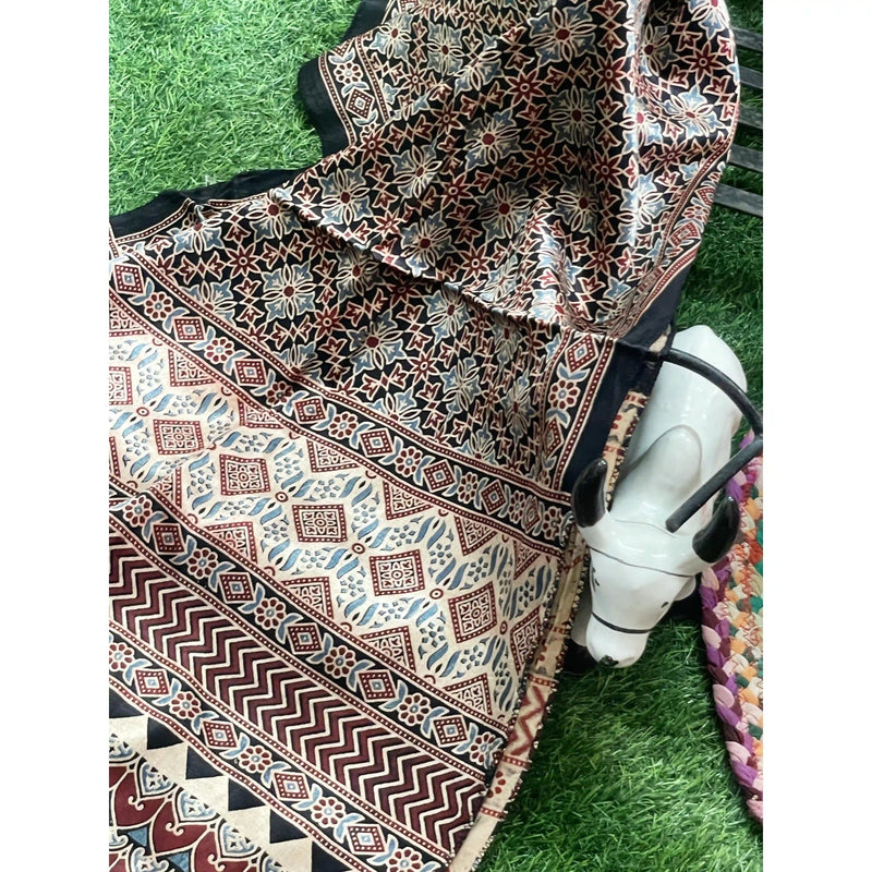 Each stole is adorned with Ajrakh hand block prints, an age-old technique from Kutch and Barmer. Skilled artisans hand-carve intricate patterns onto wooden blocks and print them using natural dyes derived from plants and minerals. The result is a stunning tapestry of geometric motifs in deep indigo, crimson, and earthy tones — a celebration of India’s rich textile heritage.