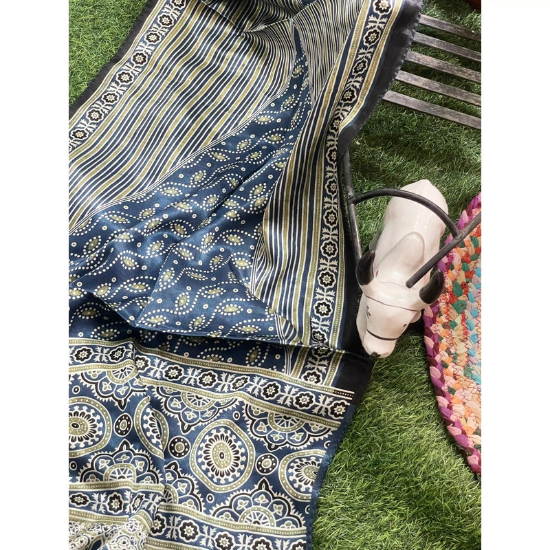 Each stole is adorned with Ajrakh hand block prints, an age-old technique from Kutch and Barmer. Skilled artisans hand-carve intricate patterns onto wooden blocks and print them using natural dyes derived from plants and minerals. The result is a stunning tapestry of geometric motifs in deep indigo, crimson, and earthy tones — a celebration of India’s rich textile heritage.
