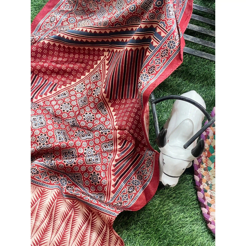 Each stole is adorned with Ajrakh hand block prints, an age-old technique from Kutch and Barmer. Skilled artisans hand-carve intricate patterns onto wooden blocks and print them using natural dyes derived from plants and minerals. The result is a stunning tapestry of geometric motifs in deep indigo, crimson, and earthy tones — a celebration of India’s rich textile heritage.