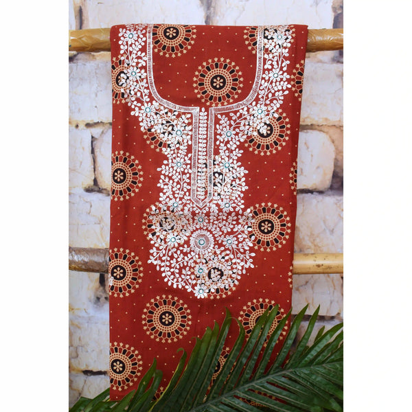 The interplay of bold Ajrakh motifs and subtle Pittan embroidery makes this fabric ideal for festive gatherings, cultural events, or elevated everyday wear. It carries the timeless spirit of Kutch block printing while offering a polished designer finish.