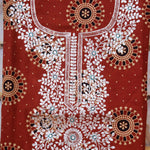 Our Ajrakh Double Block Pittan Work Kurti Fabrics celebrate the richness of heritage craftsmanship with a contemporary structured finish. The fabric features traditional Ajrakh double block printing, known for its layered depth and symmetrical geometric patterns, enhanced with refined Pittan machine embroidery for added texture and dimension.