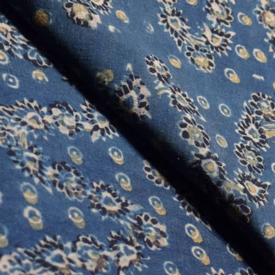 Ajrakh is usually found in Kutch (Gujarat) and Barmer (Rajasthan). Woodblock stamps are used to create different geometric patterns that are transferred onto the fabric using natural dyes, including vegetable and mineral dyes. The most common colours used include blue, red, black, yellow and green. One of the most common dyes used for this type of printing is indigo. Ajrak has been dated back to Mohenjo-daro, where the kings and royals have been shown wearing similar prints to those observed in ajrak patterns today. The beauty of ajrak is in its simplistic yet elegant patterns and natural texture.