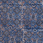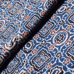 Ajrakh is usually found in Kutch (Gujarat) and Barmer (Rajasthan). Woodblock stamps are used to create different geometric patterns that are transferred onto the fabric using natural dyes, including vegetable and mineral dyes. The most common colours used include blue, red, black, yellow and green. One of the most common dyes used for this type of printing is indigo. Ajrakh has been dated back to Mohenjo-daro, where the kings and royals have been shown wearing similar prints to those observed in ajrak patterns today. The beauty of ajrak is in its simplistic yet elegant patterns and natural texture. This is handblock print fabric with natural dyes so small differences in colour and irregularities in prints are normal and the beauty of the art.