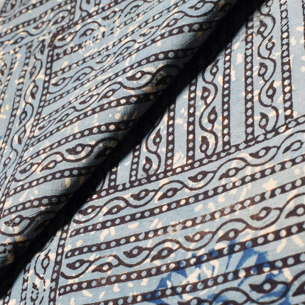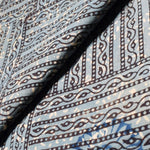 Ajrakh is usually found in Kutch (Gujarat) and Barmer (Rajasthan). Woodblock stamps are used to create different geometric patterns that are transferred onto the fabric using natural dyes, including vegetable and mineral dyes. The most common colours used include blue, red, black, yellow and green. One of the most common dyes used for this type of printing is indigo. Ajrakh has been dated back to Mohenjo-daro, where the kings and royals have been shown wearing similar prints to those observed in ajrak patterns today. The beauty of ajrak is in its simplistic yet elegant patterns and natural texture. This is handblock print fabric with natural dyes so small differences in colour and irregularities in prints are normal and the beauty of the art.