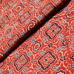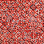 Ajrakh is usually found in Kutch (Gujarat) and Barmer (Rajasthan). Woodblock stamps are used to create different geometric patterns that are transferred onto the fabric using natural dyes, including vegetable and mineral dyes. The most common colours used include blue, red, black, yellow and green. One of the most common dyes used for this type of printing is indigo. Ajrakh has been dated back to Mohenjo-daro, where the kings and royals have been shown wearing similar prints to those observed in ajrak patterns today. The beauty of ajrak is in its simplistic yet elegant patterns and natural texture. This is handblock print fabric with natural dyes so small differences in colour and irregularities in prints are normal and the beauty of the art.