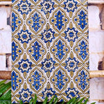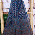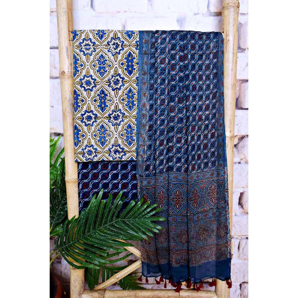 Ajrakh is usually found in Kutch (Gujarat) and Barmer (Rajasthan). Woodblock stamps are used to create different geometric patterns that are transferred onto the fabric using natural dyes, including vegetable and mineral dyes. The most common colours used include blue, red, black, yellow and green. One of the most common dyes used for this type of printing is indigo. Ajrak has been dated back to Mohenjo-daro, where the kings and royals have been shown wearing similar prints to those observed in ajrak patterns today. The beauty of ajrak is in its simplistic yet elegant patterns and natural texture. This is handblock print fabric with natural dyes so small differences in colour and irregularities in prints are normal and the beauty of the art.