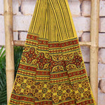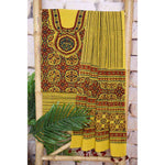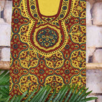 Ajrakh is usually found in Kutch (Gujarat) and Barmer (Rajasthan). Woodblock stamps are used to create different geometric patterns that are transferred onto the fabric using natural dyes, including vegetable and mineral dyes. The most common colours used include blue, red, black, yellow and green. One of the most common dyes used for this type of printing is indigo. Ajrak has been dated back to Mohenjo-daro, where the kings and royals have been shown wearing similar prints to those observed in ajrak patterns today. The beauty of ajrak is in its simplistic yet elegant patterns and natural texture. This is handblock print fabric with natural dyes so small differences in colour and irregularities in prints are normal and the beauty of the art.