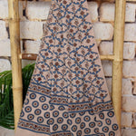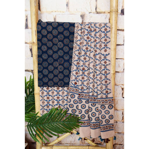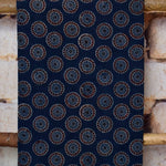 Ajrakh is usually found in Kutch (Gujarat) and Barmer (Rajasthan). Woodblock stamps are used to create different geometric patterns that are transferred onto the fabric using natural dyes, including vegetable and mineral dyes. The most common colours used include blue, red, black, yellow and green. One of the most common dyes used for this type of printing is indigo. Ajrak has been dated back to Mohenjo-daro, where the kings and royals have been shown wearing similar prints to those observed in ajrak patterns today. The beauty of ajrak is in its simplistic yet elegant patterns and natural texture. This is handblock print fabric with natural dyes so small differences in colour and irregularities in prints are normal and the beauty of the art.