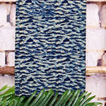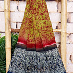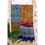 Ajrakh is usually found in Kutch (Gujarat) and Barmer (Rajasthan). Woodblock stamps are used to create different geometric patterns that are transferred onto the fabric using natural dyes, including vegetable and mineral dyes. The most common colours used include blue, red, black, yellow and green. One of the most common dyes used for this type of printing is indigo. Ajrak has been dated back to Mohenjo-daro, where the kings and royals have been shown wearing similar prints to those observed in ajrak patterns today. The beauty of ajrak is in its simplistic yet elegant patterns and natural texture.