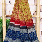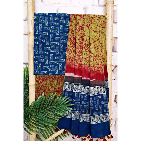 Ajrakh is usually found in Kutch (Gujarat) and Barmer (Rajasthan). Woodblock stamps are used to create different geometric patterns that are transferred onto the fabric using natural dyes, including vegetable and mineral dyes. The most common colours used include blue, red, black, yellow and green. One of the most common dyes used for this type of printing is indigo. Ajrak has been dated back to Mohenjo-daro, where the kings and royals have been shown wearing similar prints to those observed in ajrak patterns today. The beauty of ajrak is in its simplistic yet elegant patterns and natural texture.