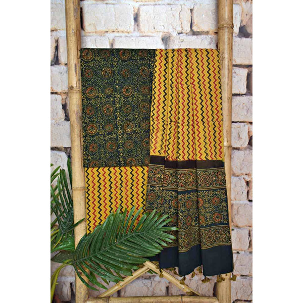 Length: 2.5m eachFabric: Cotton*Colours may vary slightly due to a difference in fabric and digital colours*Ajrakh is usually found in Kutch (Gujarat) and Barmer (Rajasthan). Woodblock stamps are used to create different geometric patterns that are transferred onto the fabric using natural dyes, including vegetable and mineral dyes. The most common colours used include blue, red, black, yellow and green. One of the most common dyes used for this type of printing is indigo. Ajrak has been dated back to Mohenjo-daro, where the kings and royals have been shown wearing similar prints to those observed in ajrak patterns today. The beauty of ajrak is in its simplistic yet elegant patterns and natural texture. This is handblock print fabric with natural dyes so small differences in colour and irregularities in prints are normal and the beauty of the art.