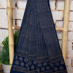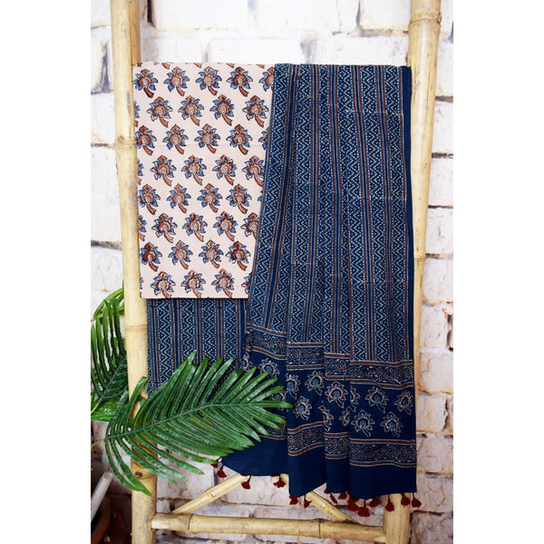 Ajrakh is usually found in Kutch (Gujarat) and Barmer (Rajasthan). Woodblock stamps are used to create different geometric patterns that are transferred onto the fabric using natural dyes, including vegetable and mineral dyes. The most common colours used include blue, red, black, yellow and green. One of the most common dyes used for this type of printing is indigo. Ajrak has been dated back to Mohenjo-daro, where the kings and royals have been shown wearing similar prints to those observed in ajrak patterns today. The beauty of ajrak is in its simplistic yet elegant patterns and natural texture. This is handblock print fabric with natural dyes so small differences in colour and irregularities in prints are normal and the beauty of the art.