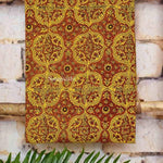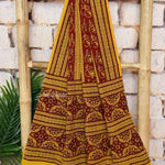 Ajrakh is usually found in Kutch (Gujarat) and Barmer (Rajasthan). Woodblock stamps are used to create different geometric patterns that are transferred onto the fabric using natural dyes, including vegetable and mineral dyes. The most common colours used include blue, red, black, yellow and green. One of the most common dyes used for this type of printing is indigo. Ajrak has been dated back to Mohenjo-daro, where the kings and royals have been shown wearing similar prints to those observed in ajrak patterns today. The beauty of ajrak is in its simplistic yet elegant patterns and natural texture. This is a handblock print fabric, and so there are irregularities in the prints and designs pertaining to handwork. The colours used are all natural dyes, so certain bleeding might also be observed in the initial washes. That is the beauty of this art, and is not an imperfection