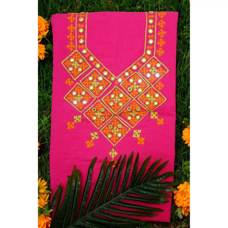 The neckline features a generously worked 16-inch yoke, intricately embroidered by skilled artisans, reflecting generations of Sindhi craftsmanship. Each piece stands out as a unique expression of heritage, artistry, and effort.