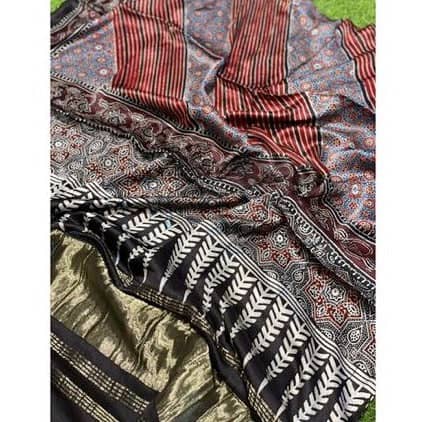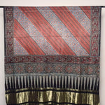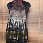 Made with the special ajrakh process - each dupatta has first been block printed, then brush dyed with black, then brush dyed with madder and finally dip dyed in indigo to get the three background colours in one piece of clothing.