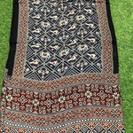 Ajrakh is usually found in Kutch (Gujarat) and Barmer (Rajasthan). Woodblock stamps are used to create different geometric patterns that are transferred onto the fabric using natural dyes, including vegetable and mineral dyes. The most common colours used include blue, red, black, yellow and green. One of the most common dyes used for this type of printing is indigo. Ajrak has been dated back to Mohenjo-daro, where the kings and royals have been shown wearing similar prints to those observed in ajrak patterns today. The beauty of ajrak is in its simplistic yet elegant patterns and natural texture. This fabric is a manual screen print fabric, and not hand block print or machine screen print.