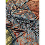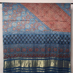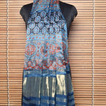 Made with the special ajrakh process - each dupatta has first been block printed, then brush dyed with black, then brush dyed with madder and finally dip dyed in indigo to get the three background colours in one piece of clothing.