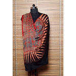 Ajrakh is usually found in Kutch (Gujarat) and Barmer (Rajasthan). Woodblock stamps are used to create different geometric patterns that are transferred onto the fabric using natural dyes, including vegetable and mineral dyes. The most common colours used include blue, red, black, yellow and green. One of the most common dyes used for this type of printing is indigo. Ajrak has been dated back to Mohenjo-daro, where the kings and royals have been shown wearing similar prints to those observed in ajrak patterns today. The beauty of ajrak is in its simplistic yet elegant patterns and natural texture. This fabric is a manual screen print fabric, and not hand block print or machine screen print.