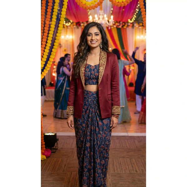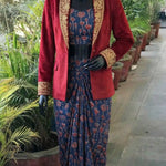 Our CHITRA blouse-draped skirt set is a beautiful ode to the age-old craft of Ajrakh from towns of Dhamadka and Ajrakhpur in Gujarat. We've tried to incorporate the traditional craft into modern silhouettes to give it a touch of royalty while staying true to the roots. Authentically hand made, this set is a beautiful mix of modern and traditional. Paired with a zardosi work blazer, this gives it a unique and festive look.