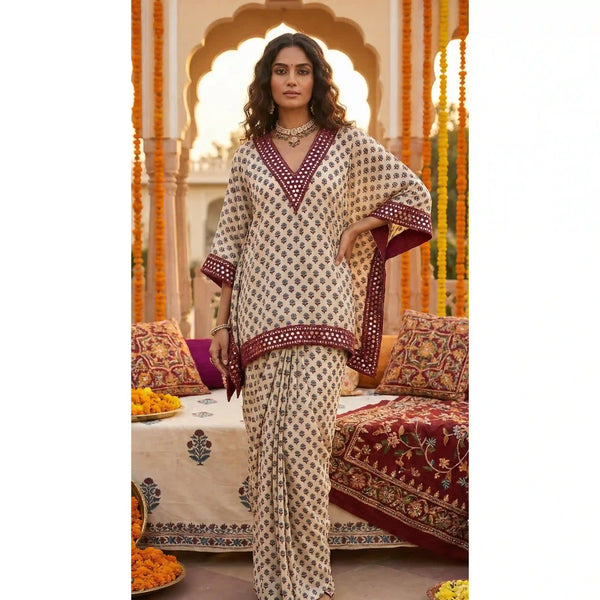 Our RAGA Kaftan-draped skirt set is a beautiful ode to the age-old craft of Ajrakh from towns of Dhamadka and Ajrakhpur in Gujarat. We've tried to incorporate the traditional craft into modern silhouettes to give it a touch of royalty while staying true to the roots. Authentically hand made, this set is a beautiful mix of modern and traditional. With a touch of mirror work, it blends the crafts from Bhuj beautifully.
