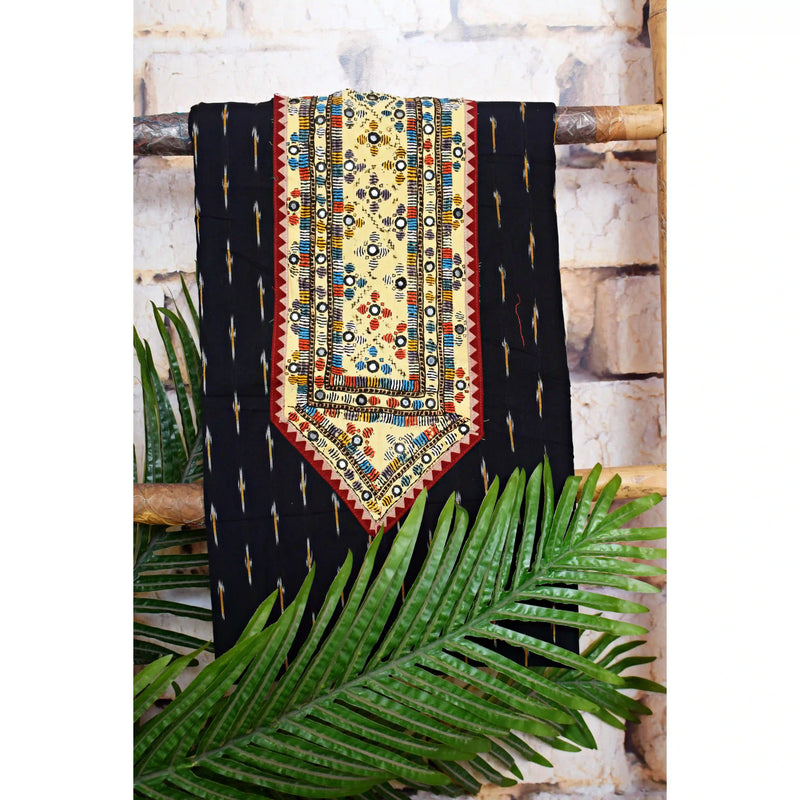 Our Ikat Kutch Old Work Kurtis bring together two timeless Indian crafts – the precision of Ikat weaving and the soulful artistry of Kutch embroidery. Handcrafted patches of embroidery, done painstakingly by Rabari women artisans, are placed onto rich cotton ikat fabric, creating a stunning union of texture, tradition, and story.