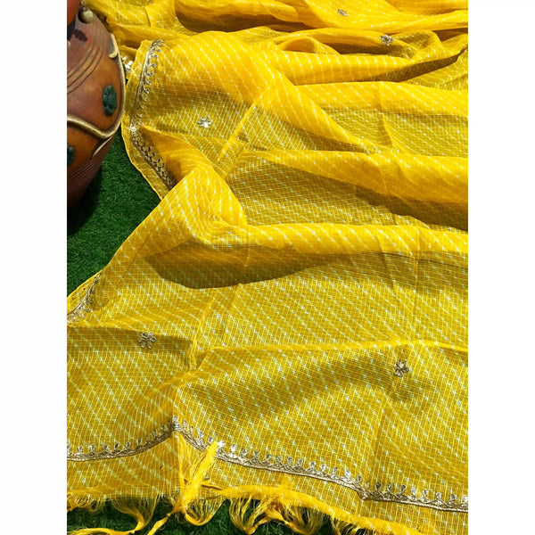 Add a burst of colour and tradition to your wardrobe with our Kota Doria dupattas, adorned in the age-old art of Leheriya and Bandhani. Crafted in Rajasthan, these dupattas capture the essence of festive vibrance through delicate wave-like patterns and fine tie-dye dots.