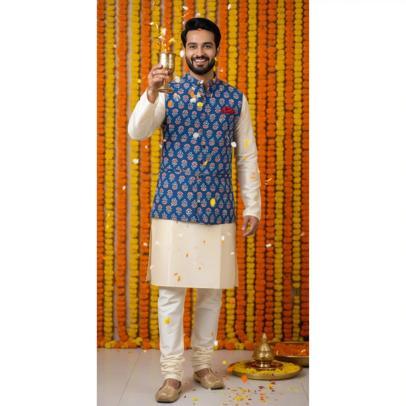 Made using handwoven Ikat and Ajrakh block-printed fabrics, these kotis bring together centuries-old Indian textile traditions in a modern, versatile form. Each piece is crafted with care to highlight the depth of artisan techniques — Ikat with its resist-dye precision and Ajrakh with its natural dye geometry. Designed to layer effortlessly over kurtas or shirts, they add instant festive polish and timeless character to your wardrobe.