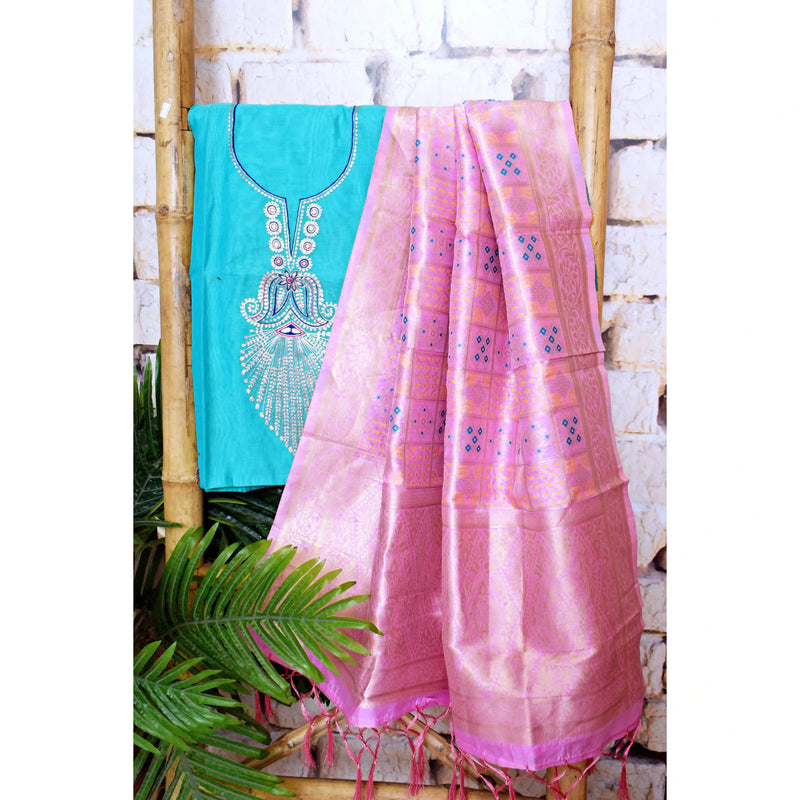 Our Cotton Silk Pittan Two Piece Sets bring together two rich traditions of Indian textile art. The kurti fabric is crafted in luxurious cotton silk, known for its soft sheen and breathable comfort, and is enhanced with Pittan embroidery. This age-old craft uses metallic threads to create delicate handwork that adds understated grandeur to the fabric.