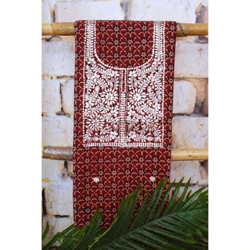 Our Ajrakh Double Block Pittan Work Kurti Fabrics celebrate the richness of heritage craftsmanship with a contemporary structured finish. The fabric features traditional Ajrakh double block printing, known for its layered depth and symmetrical geometric patterns, enhanced with refined Pittan machine embroidery for added texture and dimension.