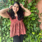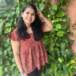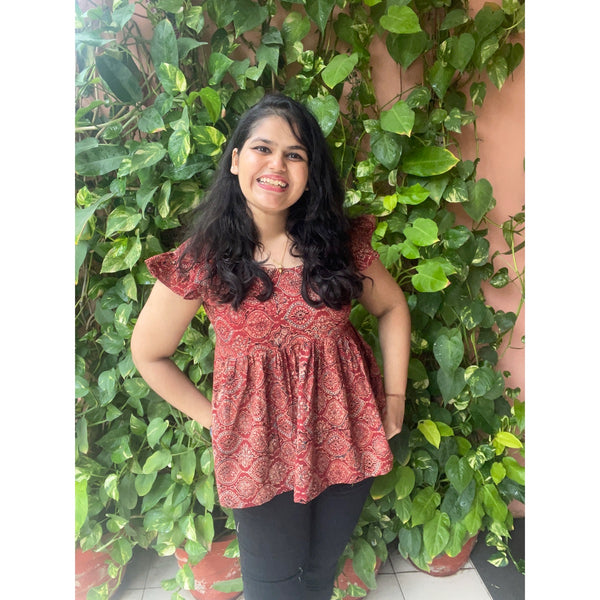 <div> Flared Ajrakh top with frilled sleeves and criss-cross tie detailing on the back. </div><div><br></div><div>