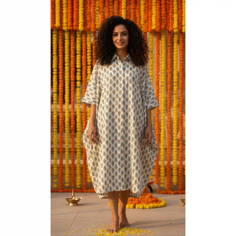 Each piece carries the warmth of handwork – slight irregularities in print and dye are natural, enhancing the unique charm of handcrafted textiles. Light, breezy and rooted in tradition, this kaftan shirt dress effortlessly merges comfort with culture.