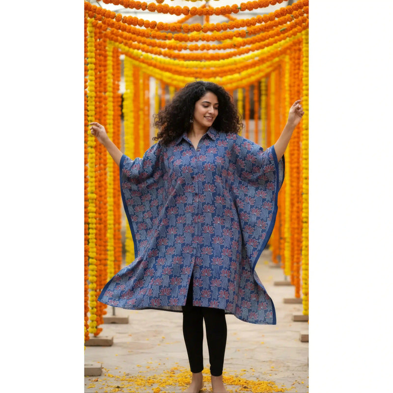 Each piece carries the warmth of handwork – slight irregularities in print and dye are natural, enhancing the unique charm of handcrafted textiles. Light, breezy and rooted in tradition, this kaftan shirt dress effortlessly merges comfort with culture.