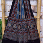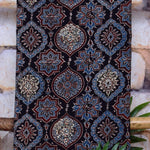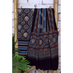 Ajrakh is usually found in Kutch (Gujarat) and Barmer (Rajasthan). Woodblock stamps are used to create different geometric patterns that are transferred onto the fabric using natural dyes, including vegetable and mineral dyes. The most common colours used include blue, red, black, yellow and green. One of the most common dyes used for this type of printing is indigo. Ajrak has been dated back to Mohenjo-daro, where the kings and royals have been shown wearing similar prints to those observed in ajrak patterns today. The beauty of ajrak is in its simplistic yet elegant patterns and natural texture. This is handblock print fabric with natural dyes so small differences in colour and irregularities in prints are normal and the beauty of the art.