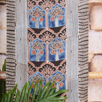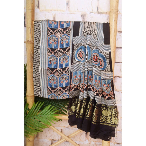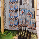 Ajrakh is usually found in Kutch (Gujarat) and Barmer (Rajasthan). Woodblock stamps are used to create different geometric patterns that are transferred onto the fabric using natural dyes, including vegetable and mineral dyes. The most common colours used include blue, red, black, yellow and green. One of the most common dyes used for this type of printing is indigo. Ajrak has been dated back to Mohenjo-daro, where the kings and royals have been shown wearing similar prints to those observed in ajrak patterns today. The beauty of ajrak is in its simplistic yet elegant patterns and natural texture. This is handblock print fabric with natural dyes so small differences in colour and irregularities in prints are normal and the beauty of the art.