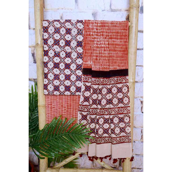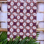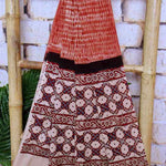Ajrakh is usually found in Kutch (Gujarat) and Barmer (Rajasthan). Woodblock stamps are used to create different geometric patterns that are transferred onto the fabric using natural dyes, including vegetable and mineral dyes. The most common colours used include blue, red, black, yellow and green. One of the most common dyes used for this type of printing is indigo. Ajrak has been dated back to Mohenjo-daro, where the kings and royals have been shown wearing similar prints to those observed in ajrak patterns today. The beauty of ajrak is in its simplistic yet elegant patterns and natural texture. This is handblock print fabric with natural dyes so small differences in colour and irregularities in prints are normal and the beauty of the art.