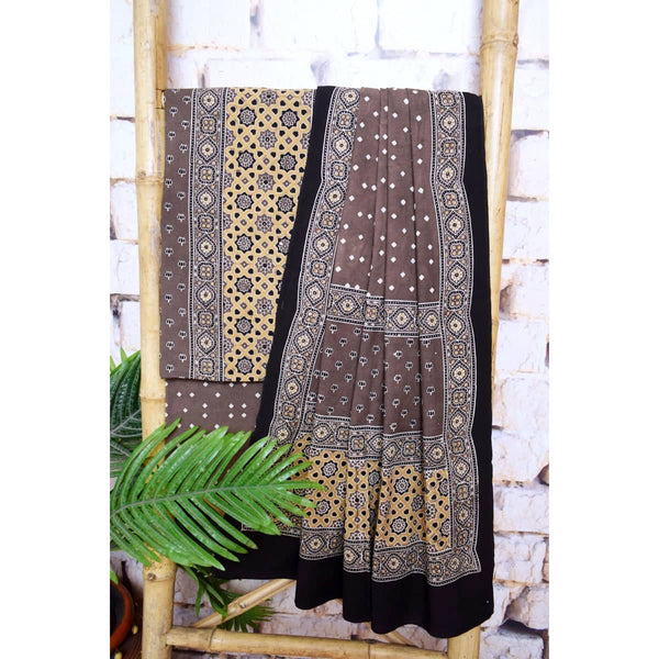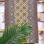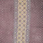 Ajrakh is usually found in Kutch (Gujarat) and Barmer (Rajasthan). Woodblock stamps are used to create different geometric patterns that are transferred onto the fabric using natural dyes, including vegetable and mineral dyes. The most common colours used include blue, red, black, yellow and green. One of the most common dyes used for this type of printing is indigo. Ajrak has been dated back to Mohenjo-daro, where the kings and royals have been shown wearing similar prints to those observed in ajrak patterns today. The beauty of ajrak is in its simplistic yet elegant patterns and natural texture. This is handblock print fabric with natural dyes so small differences in colour and irregularities in prints are normal and the beauty of the art.