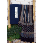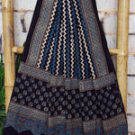 Ajrakh is usually found in Kutch (Gujarat) and Barmer (Rajasthan). Woodblock stamps are used to create different geometric patterns that are transferred onto the fabric using natural dyes, including vegetable and mineral dyes. The most common colours used include blue, red, black, yellow and green. One of the most common dyes used for this type of printing is indigo. Ajrak has been dated back to Mohenjo-daro, where the kings and royals have been shown wearing similar prints to those observed in ajrak patterns today. The beauty of ajrak is in its simplistic yet elegant patterns and natural texture. This is handblock print fabric with natural dyes so small differences in colour and irregularities in prints are normal and the beauty of the art.