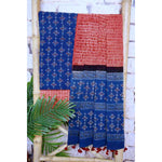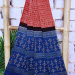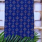 Ajrakh is usually found in Kutch (Gujarat) and Barmer (Rajasthan). Woodblock stamps are used to create different geometric patterns that are transferred onto the fabric using natural dyes, including vegetable and mineral dyes. The most common colours used include blue, red, black, yellow and green. One of the most common dyes used for this type of printing is indigo. Ajrak has been dated back to Mohenjo-daro, where the kings and royals have been shown wearing similar prints to those observed in ajrak patterns today. The beauty of ajrak is in its simplistic yet elegant patterns and natural texture. This is handblock print fabric with natural dyes so small differences in colour and irregularities in prints are normal and the beauty of the art.