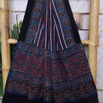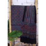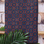 Ajrakh is usually found in Kutch (Gujarat) and Barmer (Rajasthan). Woodblock stamps are used to create different geometric patterns that are transferred onto the fabric using natural dyes, including vegetable and mineral dyes. The most common colours used include blue, red, black, yellow and green. One of the most common dyes used for this type of printing is indigo. Ajrak has been dated back to Mohenjo-daro, where the kings and royals have been shown wearing similar prints to those observed in ajrak patterns today. The beauty of ajrak is in its simplistic yet elegant patterns and natural texture. This is handblock print fabric with natural dyes so small differences in colour and irregularities in prints are normal and the beauty of the art.