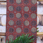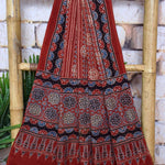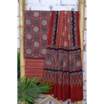 Ajrakh is usually found in Kutch (Gujarat) and Barmer (Rajasthan). Woodblock stamps are used to create different geometric patterns that are transferred onto the fabric using natural dyes, including vegetable and mineral dyes. The most common colours used include blue, red, black, yellow and green. One of the most common dyes used for this type of printing is indigo. Ajrak has been dated back to Mohenjo-daro, where the kings and royals have been shown wearing similar prints to those observed in ajrak patterns today. The beauty of ajrak is in its simplistic yet elegant patterns and natural texture. This is handblock print fabric with natural dyes so small differences in colour and irregularities in prints are normal and the beauty of the art.