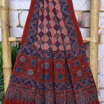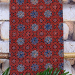 Ajrakh is usually found in Kutch (Gujarat) and Barmer (Rajasthan). Woodblock stamps are used to create different geometric patterns that are transferred onto the fabric using natural dyes, including vegetable and mineral dyes. The most common colours used include blue, red, black, yellow and green. One of the most common dyes used for this type of printing is indigo. Ajrak has been dated back to Mohenjo-daro, where the kings and royals have been shown wearing similar prints to those observed in ajrak patterns today. The beauty of ajrak is in its simplistic yet elegant patterns and natural texture. This is handblock print fabric with natural dyes so small differences in colour and irregularities in prints are normal and the beauty of the art.