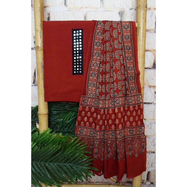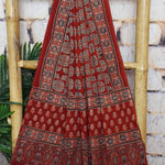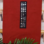 Ajrakh is usually found in Kutch (Gujarat) and Barmer (Rajasthan). Woodblock stamps are used to create different geometric patterns that are transferred onto the fabric using natural dyes, including vegetable and mineral dyes. The most common colours used include blue, red, black, yellow and green. One of the most common dyes used for this type of printing is indigo. Ajrak has been dated back to Mohenjo-daro, where the kings and royals have been shown wearing similar prints to those observed in ajrak patterns today. The beauty of ajrak is in its simplistic yet elegant patterns and natural texture. This is handblock print fabric with natural dyes so small differences in colour and irregularities in prints are normal and the beauty of the art.
