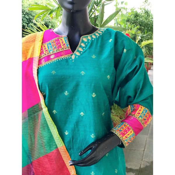 Wash Instructions: Handicraft fabrics tend to bleed during the initial washes. Please do not soak them in water or dry under direct sunlight for long lasting colours. First wash dry cleaning is recommended.
