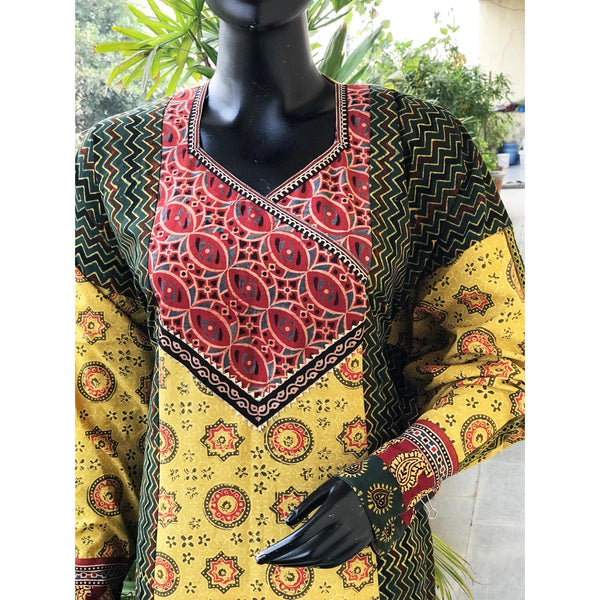 Green Ajrakh Cotton Designer Patchwork Kurti