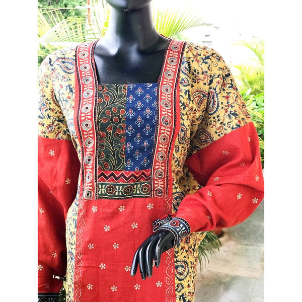 Red-Yellow Kalamkari-Khari Block Print Cotton Designer Kurti