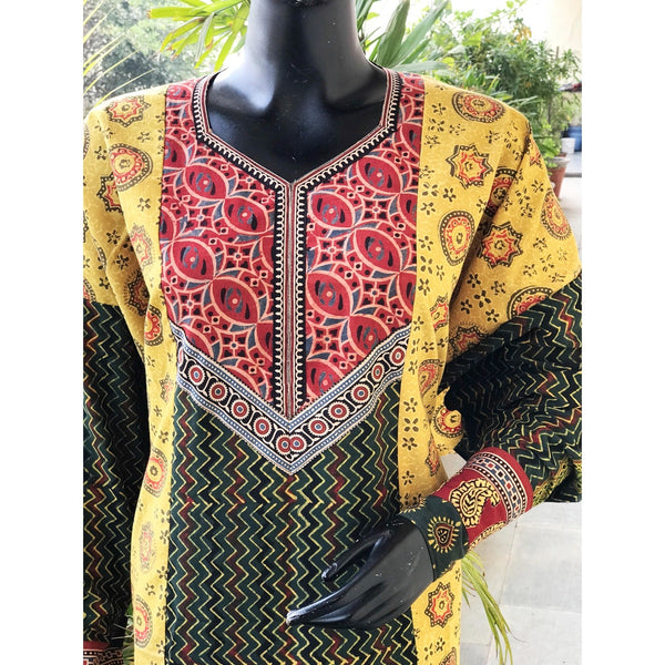 Yellow Ajrakh Cotton Designer Patchwork Kurti